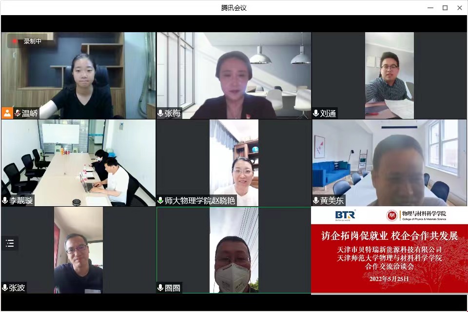 5月25日下午,Beat365唯一官方网站和天津市贝特瑞新能源科技有限公司在线上举行了“访企拓岗促就业 校企合作共发展”合作交流洽谈会。学院领导班子、天津市贝特瑞新能源科技有限公司人事部门和研发部门负责同志以及部分师生代表参加活动。